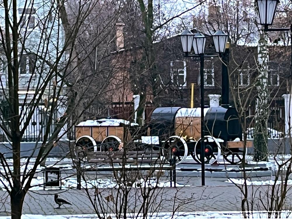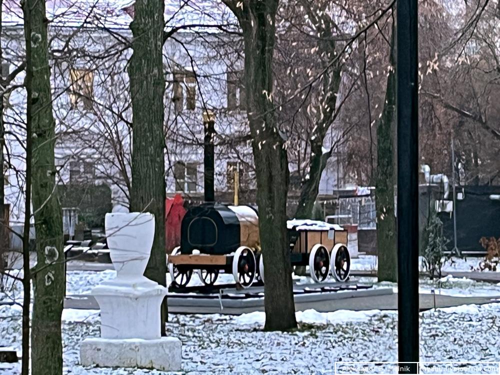 03. Вход в сквер оказался закрыт, а сам макет локомотива стоит в центре за деревьями.